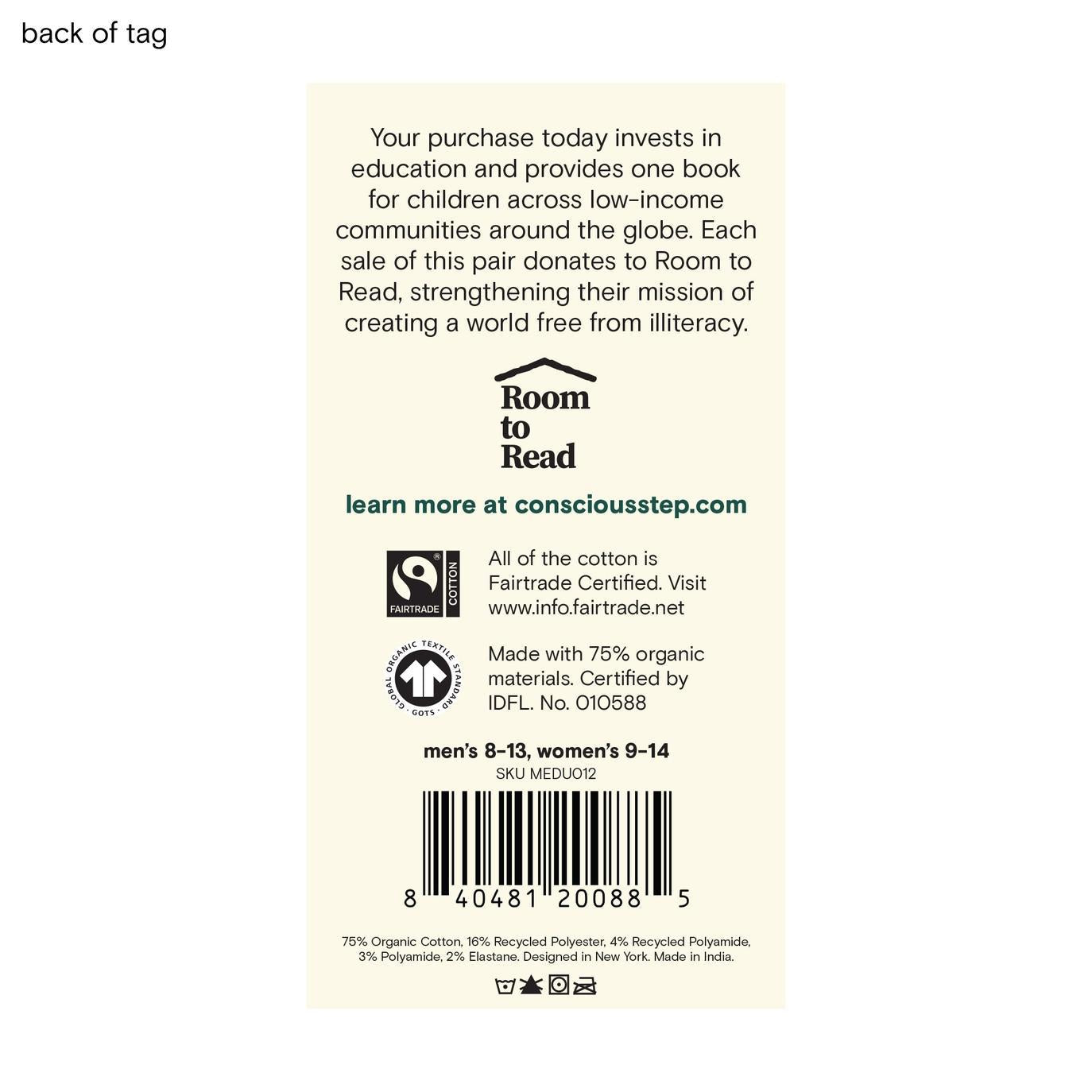 Conscious Step makes socks that change the world! Every pair donates to a partner non-profit and every purchase makes an impact. Conscious Step is proud to be Organic (GOTS), Fair Trade and Vegan Certified. The socks are made from 168 needle count cotton and feature terry padding for extra comfort.