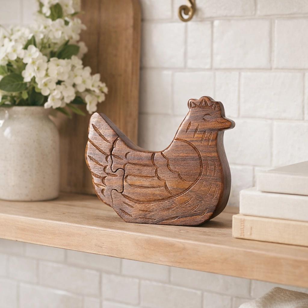 The Chicken Puzzle Box is a handcrafted rosewood keepsake featuring a playful chicken motif with a hidden storage compartment. Combining traditional Indian woodcraft with functional design, this box appeals to consumers seeking unique, giftable items that blend fun and utility.