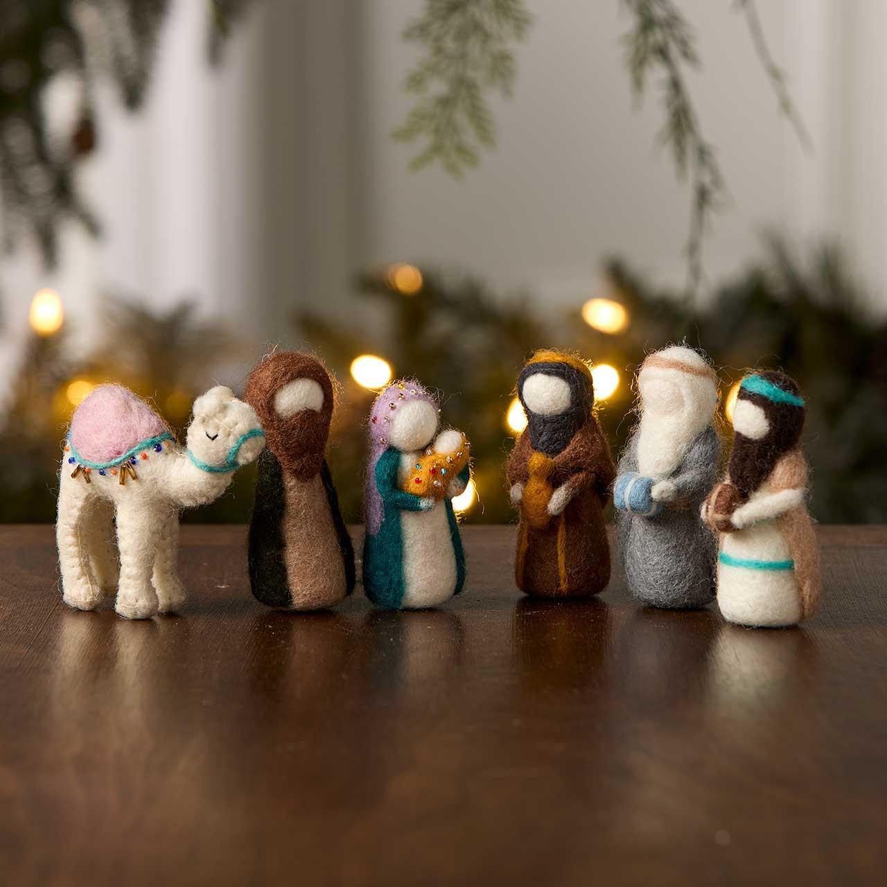 Celebrate the spirit of Christmas with this beautifully handcrafted nativity set.  This six-piece set includes the Holy Family, three Wise Men, and a charming camel.  Rustic, artistic, and full of heart, this felt nativity set offers a warm, contemporary way to honor the Christmas story.