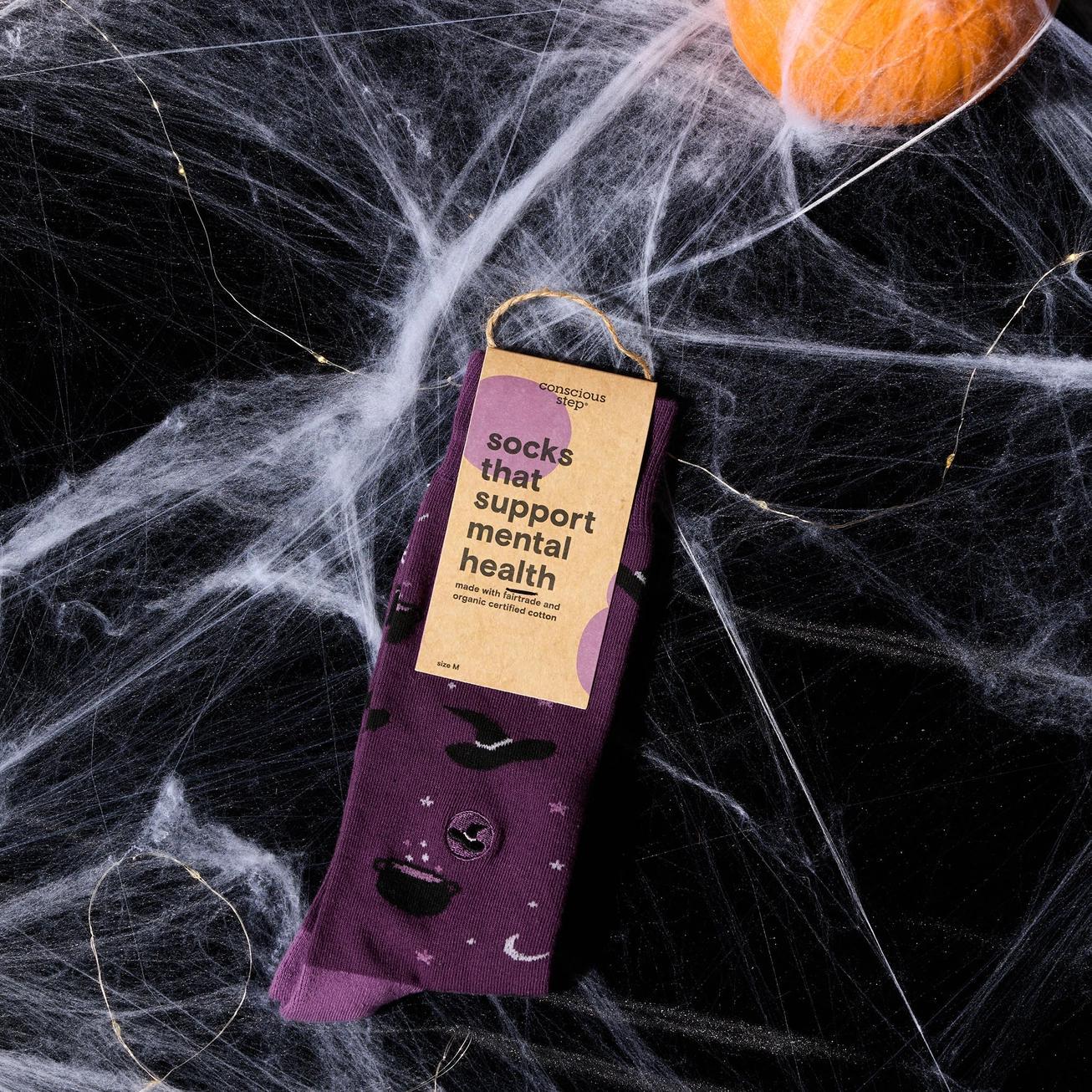 Add a little magic to your step with these wickedly cozy purple socks, decorated with playful witches, bubbling cauldrons, and zooming broomsticks. Perfect for stirring up fun or brewing a little mischief, each pair also gives back—donating $1 to NAMI to help break the stigma around mental health. Cozy, charming, and meaningful all at once!