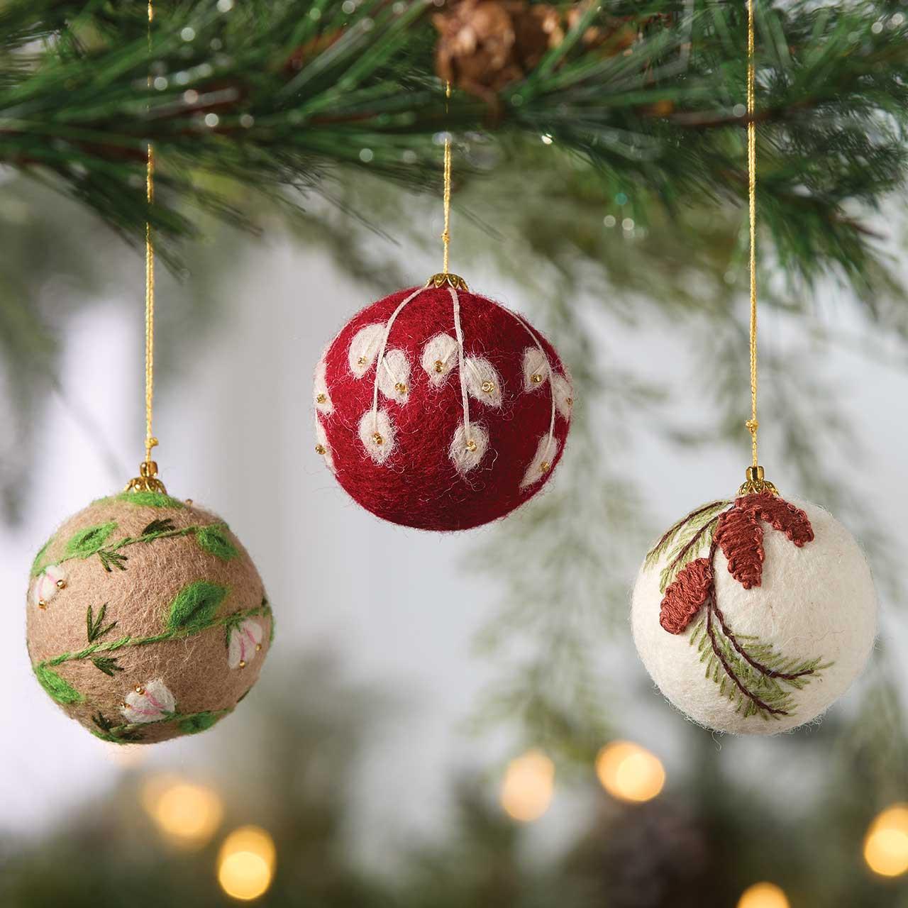 Elevate your holiday décor with this set of three Winter Felted Ball Ornaments, meticulously crafted from hand-dyed, 100% wool felt using traditional needle-felting techniques. Each globe-shaped ornament features intricate botanical accents and subtle gold bead embellishments that impart a refined festive shimmer. Designed with durable materials and convenient hanging loops, these ornaments bring an artisanal, textured warmth to your Christmas tree or seasonal display, making them an elegant choice for those who appreciate handcrafted holiday accents.