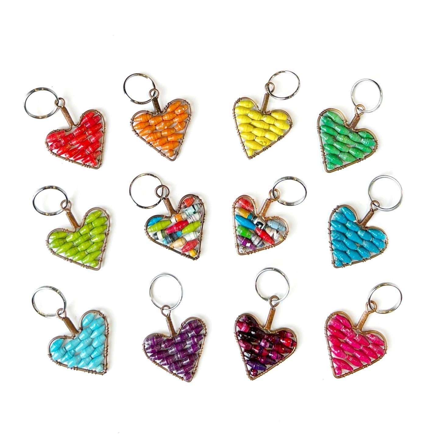 These paper bead keychains are made with upcycled paper beads from Uganda, providing a sustainable and colorful way to accessorize. These beads are handcrafted using traditional techniques, making them truly unique and special.