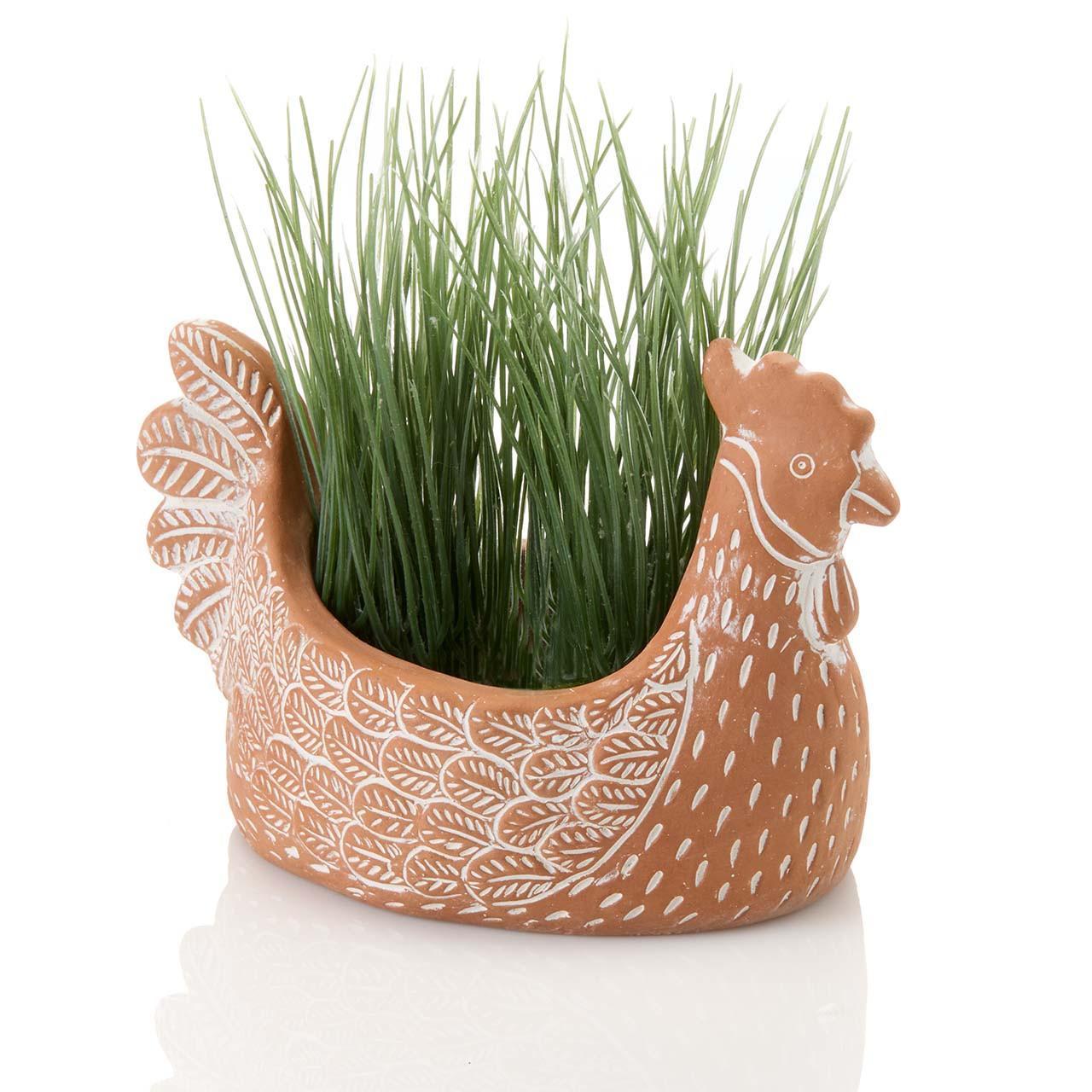 Perfect for chicken lovers and farmhouse decor enthusiasts alike, this handcrafted terracotta chicken planter brings rustic charm to any kitchen, sunroom, or indoor garden space. Carefully shaped from natural terracotta clay and finished with a rustic whitewash, each hen planter features hand-imprinted feather details and a cheerful sculpted face for added personality. Perfect for indoor use. No drainage whole.